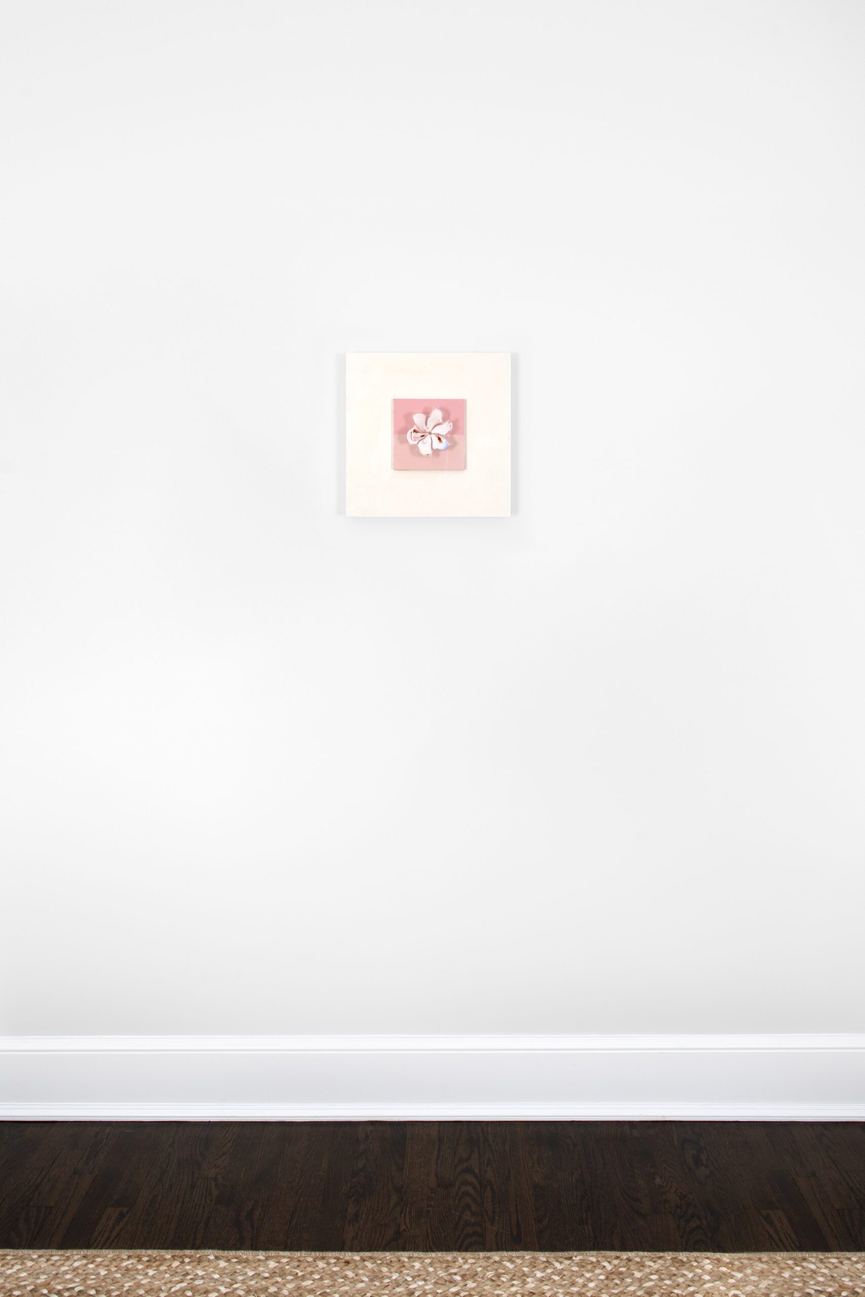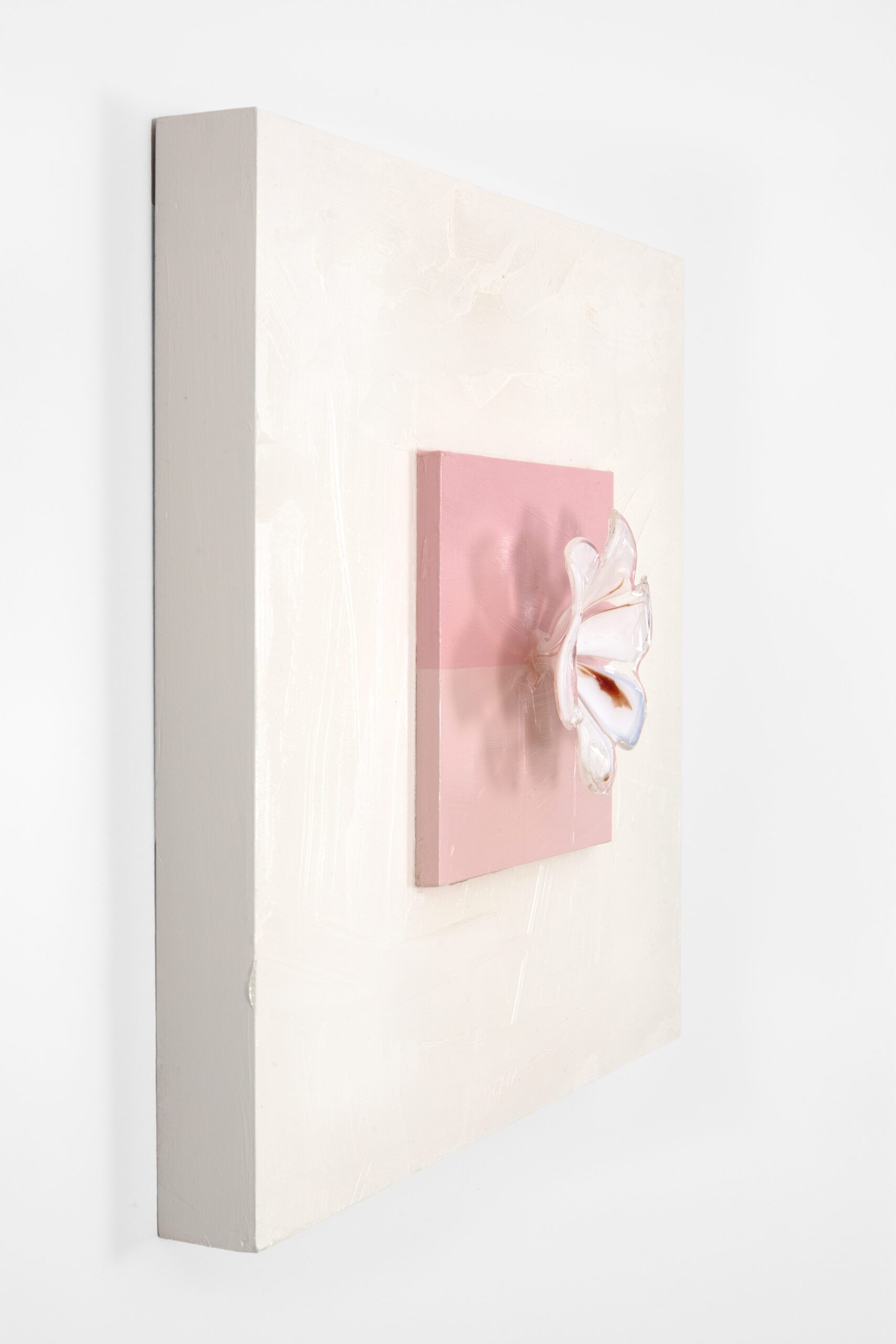 Acrylic on 6″ square wood panel mounted onto a 14″ square cradled wood panel adorned with a vintage Murano glass flower. 2-1/2″ Deep.