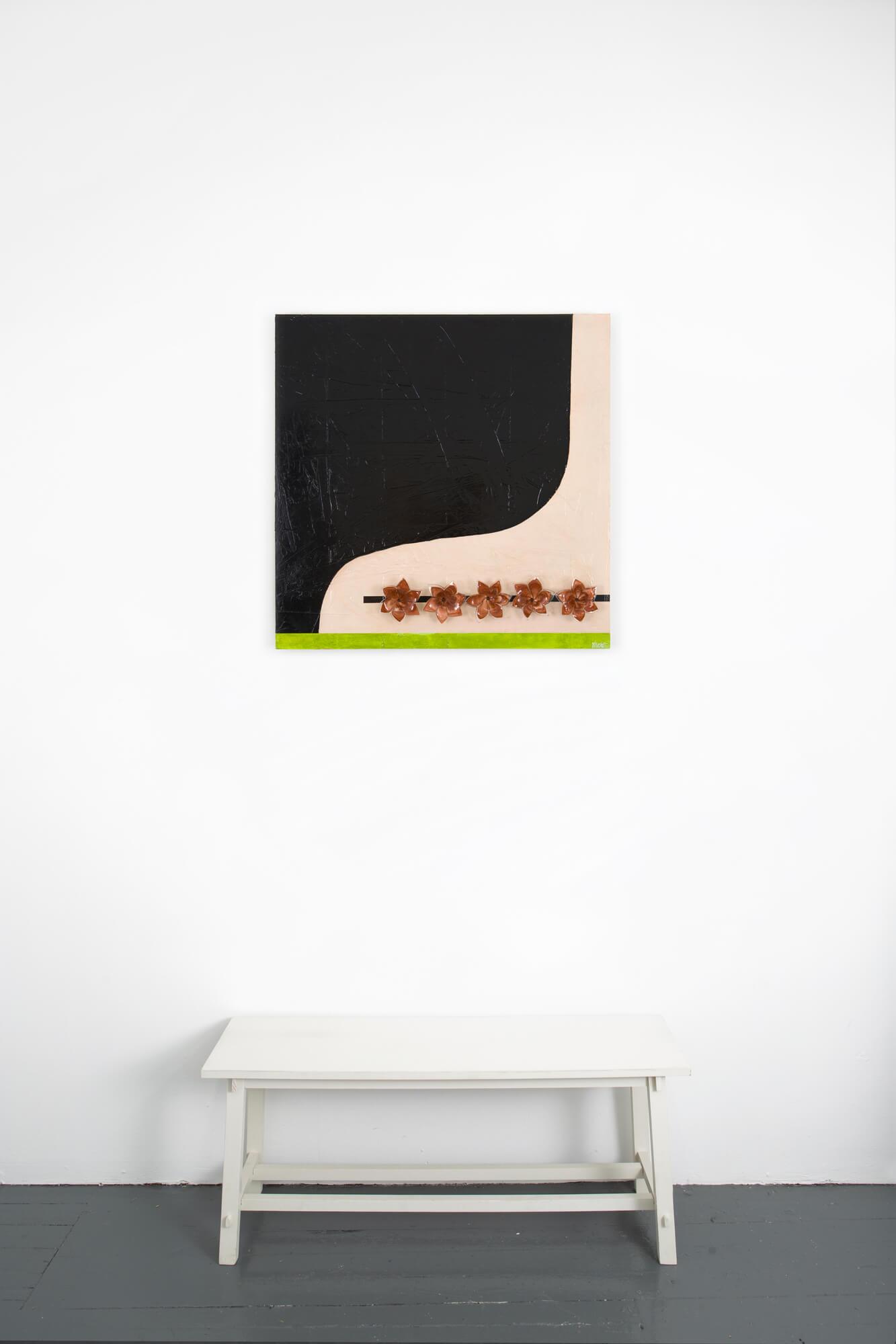 Acrylic painting on 2″ deep cradled birch wood panel adorned with antique Murano Glass flower bobeches.