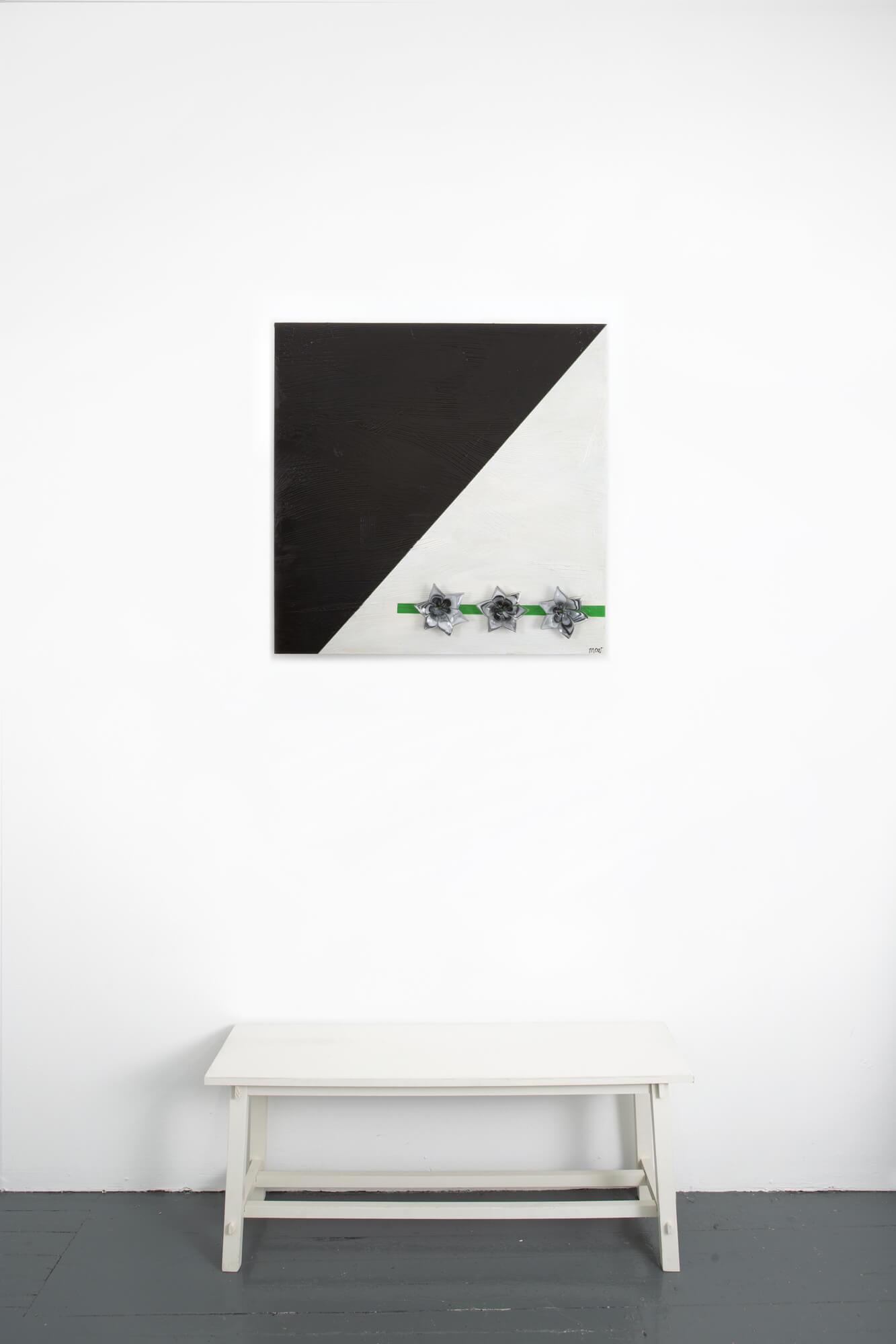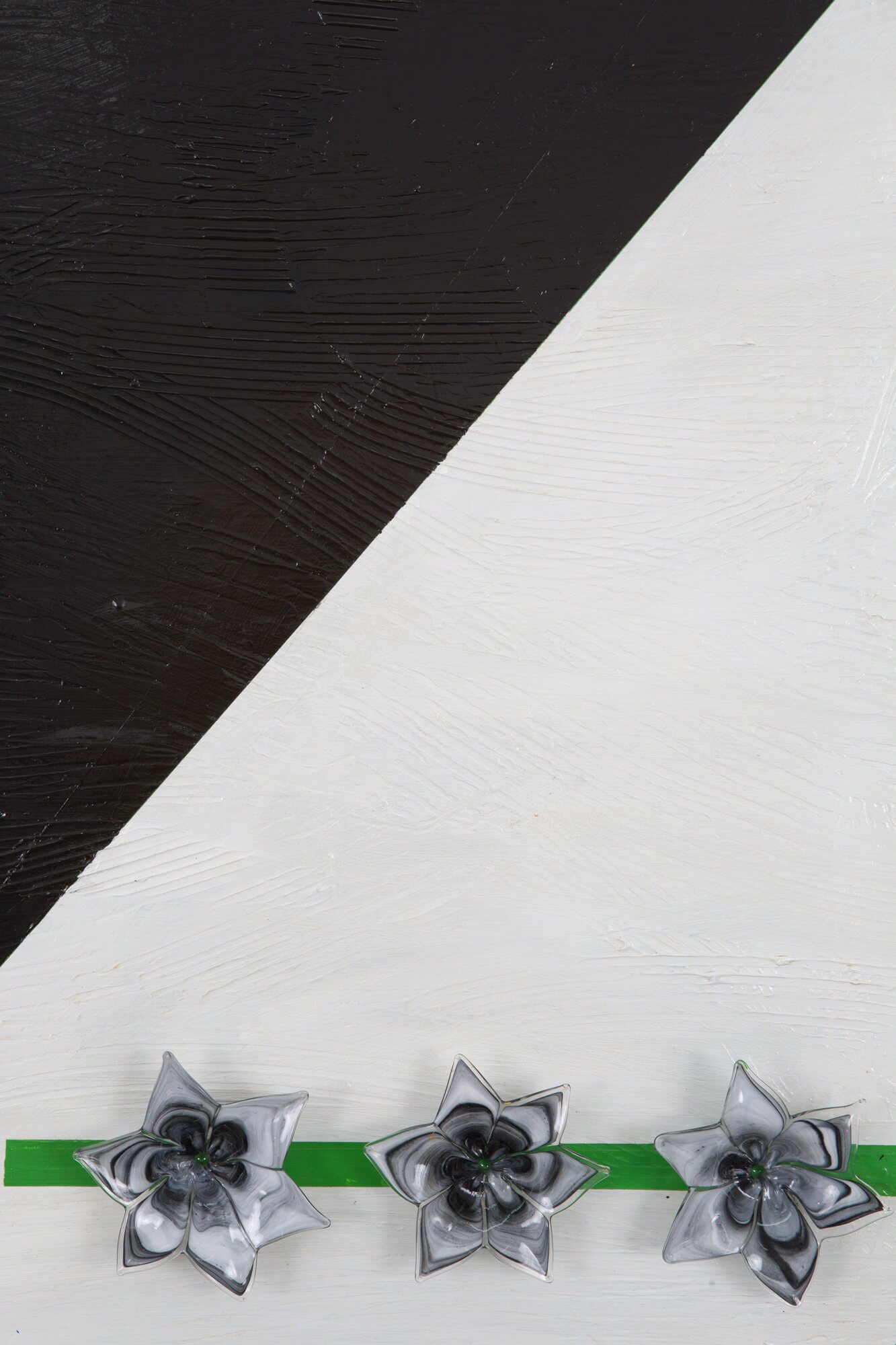 Acrylic painting on 2-1/2″ deep cradled birch wood panel adorned with antique Murano Glass flower bobeches.
