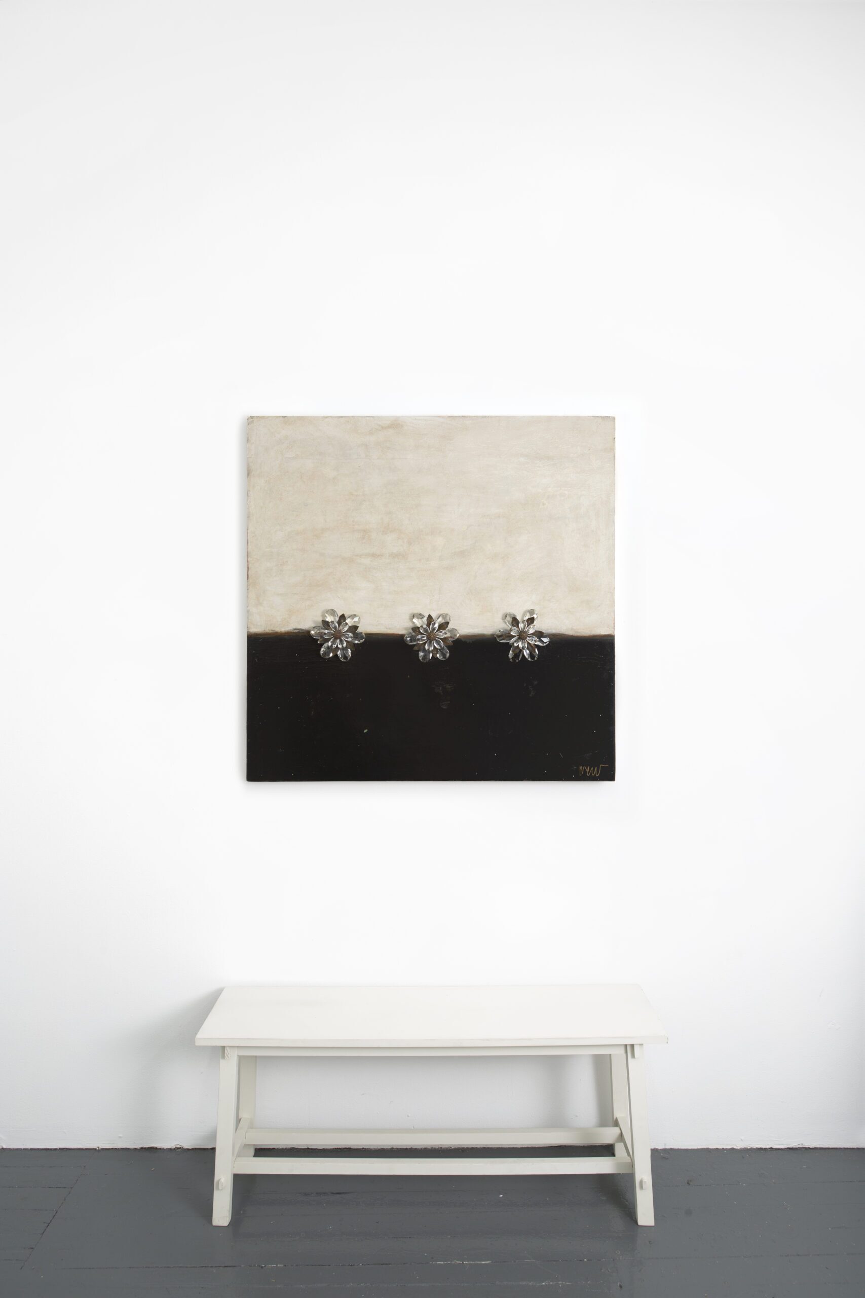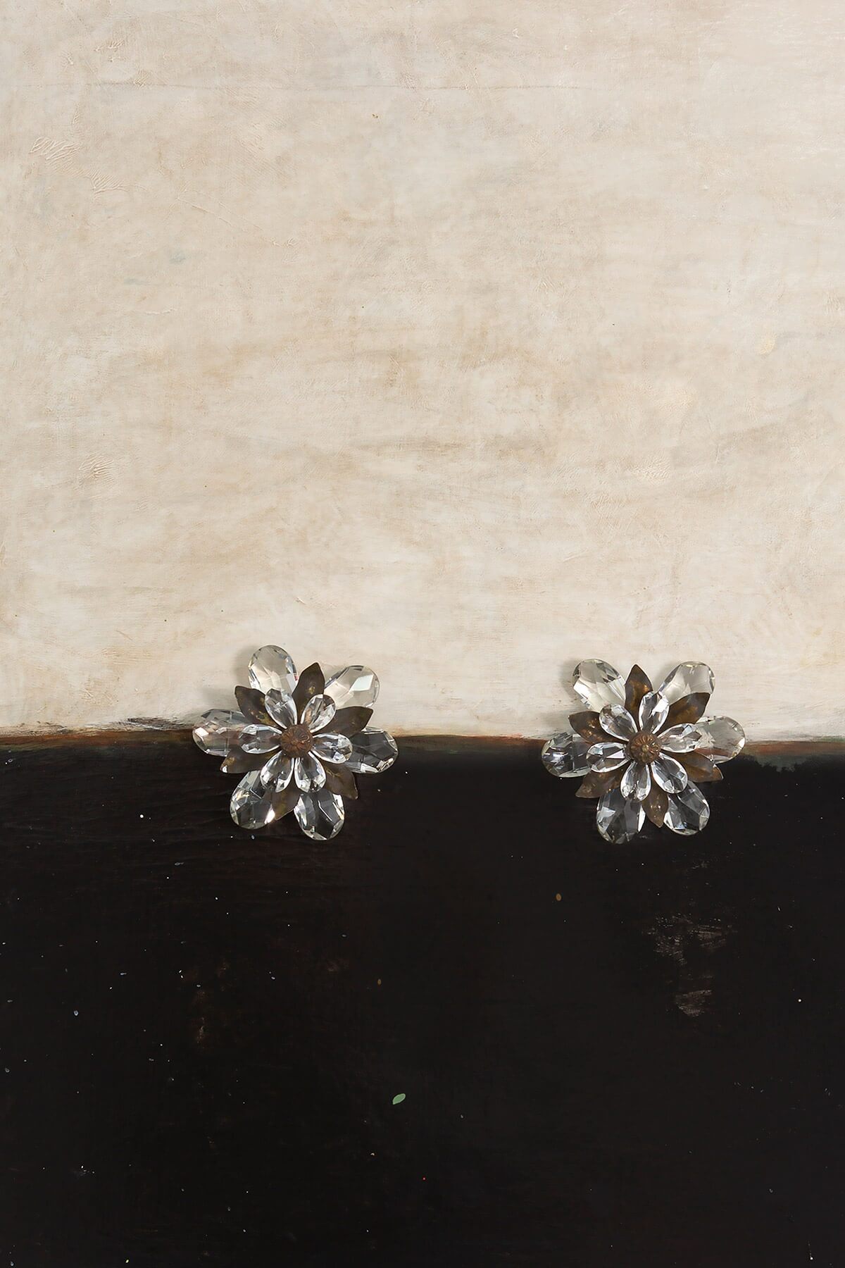 Acrylic painting on 1-1/2″ deep cradled birch wood panel adorned with flowers made from antique chandeiler crystals and brass hardware.